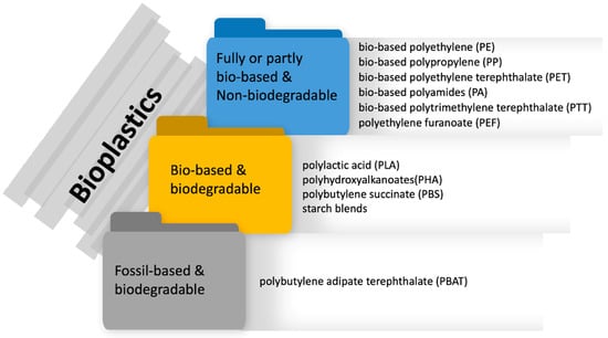 Bioplastics must comply with the requirement of either being produced from bio-based raw material or exhibiting biodegradability or possessing both properties. As displayed in Figure 1, bioplastics materials can be divided into three main categories: (i) bio-based or partly bio-based non-biodegradable plastics (e.g., bio-based PE, PP, polyethylene terephthalate (PET); polyamides (PA), polytrimethylene terephthalate (PTT), polyethylene furanoate (PEF); (ii) both bio-based and biodegradable plastics (e.g., polylactic acid (PLA), polyhydroxyalkanoates (PHA), polybutylene succinate (PBS); different starch blends and (iii) fossil-based biodegradable plastics (e.g., polybutylene adipate terephthalate (PBAT) []. Bioplastics currently represent less than 1% of total global plastic production of more than 367 million tonnes per annum [,]. However, the demand for bioplastics is growing and they are used in a variety of applications, e.g., packaging, consumer goods, electronics, textiles, automotive, agriculture, construction, etc. The majority of applications are within the packaging sector, which in 2021 accounted for approximately 48% of the total bioplastics market [].