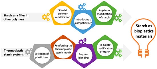 Composite materials with unique properties can also be created using starch, by incorporating various petroleum-based polymers and other biopolymers into blends with starch. In early development in the 1970s, starch was used as an additive to synthetic polymers to improve biodegradability and exploit the potential of this abundantly available natural resource []. However, the use of starch in its native forms in bioplastics applications is limited by poor material properties and water sensitivity []. Hence, various approaches to mitigate these issues have been tested over recent years []. This article reviews recent research and development on starch-based blends and composites in bioplastics applications both starch as fillers as the main component in thermoplastic starch (TPS) systems (Figure 2) Additionally, the results of attempts to overcome the associated limitations, particularly pertaining to their mechanical and barrier properties are addressed. Mainly focusing on starch as bioplastics material, this review contributes to the biopolymer scientific society together with a few comprehensive reviews that have the main focus on starch for bioplastics applications.