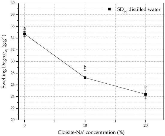 The relationship between SDeq and the amount of Cloisite-Na+ in the nanocomposites is shown in Figure 2. The reduction of SDeq for hybrid hydrogels (10 and 20% Cloisite-Na+) was 21.55% and 29.73%, respectively, when compared with PAAm + CMC hydrogel. This behavior can be attributed to the presence of nanoclay as a physical crosslinker in the polymeric matrix, which can cause a reduction in the expansion capacity of the chain and in the water storage capacity in its pores [56,57].