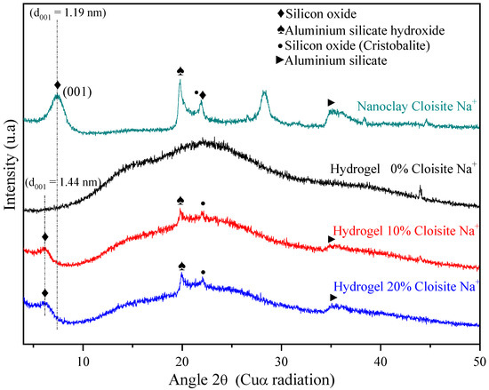 XRD analysis of the Cloisite Na+ nanoclay (Figure 3) displayed a reflection at 2θ = 7.36° assigned to the (001) crystalline plane or d001 interlayer basal spacing of 1.19 nm, agreeing with other authors [62,63]. Besides, the reflections at 2θ = 19.8°, 21.9°, and 28.3° could also be observed, and they correspond to aluminum silicate hydroxide, silicon oxide, and aluminum silicate hydroxide [30], respectively.
