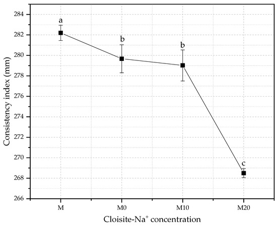 The consistency index is a parameter defined in function of the purpose of application of the cementitious material. Thus, this index measures the workability, which is considered one of the most important properties of cement-based materials, and a key, site-specific factor considered in mortar design [67]. The changes in consistency index for mortars produced with different hydrogel and nanoclay concentrations with w/c of 0.40 are shown in Figure 4.