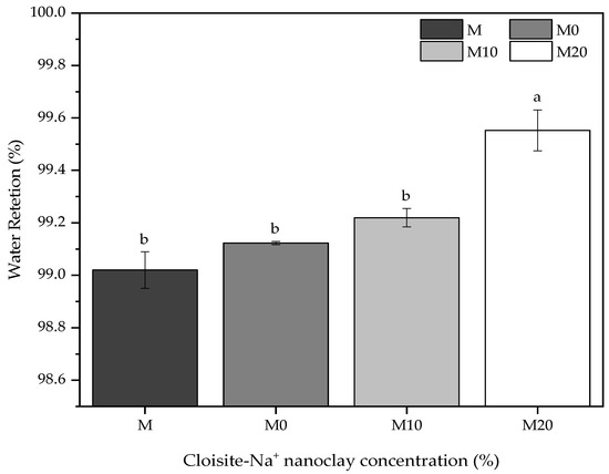 It is seen from Figure 1 that all hydrogels showed water absorption in the range of 24–32 (g·g−1) in distilled water. Also, the Cloisite-Na+ interferes directly in this hydrophilic property because the higher its concentration, the lower hydrogels swelling degree, corroborating with reported by Aalaie et al. [54]. The authors verified that the equilibrium degree of swelling of the nanocomposites decreases with the increase of montmorillonite content because the free hydrophilic groups of the nanocomposite reduce with the Na+ increases, decreasing the difference in the osmotic pressure between the matrix and the swelling medium and, consequently a retraction of the hydrogels with Cloisite-Na+ [54].