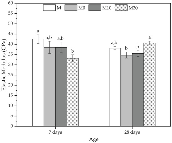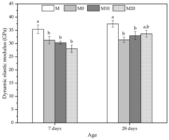 Dynamic elastic modulus was obtained using a 100 V pulsator/receiver assembly system, 500 kHz transducer frequency, and digital storage oscilloscope (TDS 2022). Finally, the measures were realized in two different regions of the prismatic sample to obtain the mortar behavior throughout the specimen. All procedure was based on the ASTM C597-16 [50], and it was determined at 7, and 28 d ages by applying Equation (7).