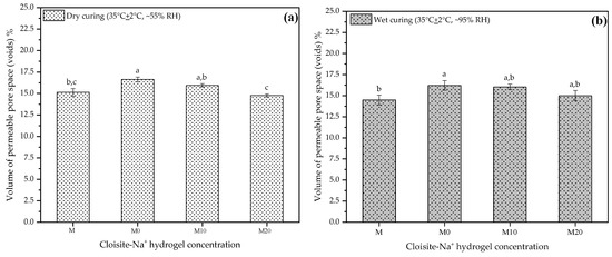 Finally, after immersion and boiling processes, all specimens had their apparent masses determined on a hydrostatic balance. Then, an estimate of the volume of permeable voids was determined by Equation (8).