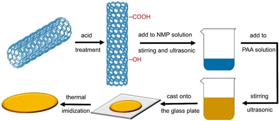 Polyamic acid (PAA, cas No. 25036-53-7, >99.6 wt.%, synthesized by 1,2,4,5-benzenetetracarboxylic anhydride (PMDA) and 4,4′-Oxydianiline (ODA)) was purchased from Xinsheng Plastic Company (Dongguan, China), which was dissolved in NMP at a ratio of 18 wt.%. N-methylpyrrolidone (NMP, cas No. 872-50-4, 99.5 wt.%) was obtained from Shanghai Adamas Reagents Company (Shanghai, China). Sulfuric acid (H2SO4, cas No. 7664-93-9, 95–98 wt.%) and nitric acid (HNO3, cas No. 7697-37-2, 65–68 wt.%) were purchased from Sinopharm Chemical Reagent Company (Shanghai, China). Multiwalled carbon nanotube (cas No. 308068-56-6, 95 wt.%, length 10–30 μm, diameter 10–20 nm) was purchased from Jiangsu XFNANO Materials Technique Company (Nanjing, China).
