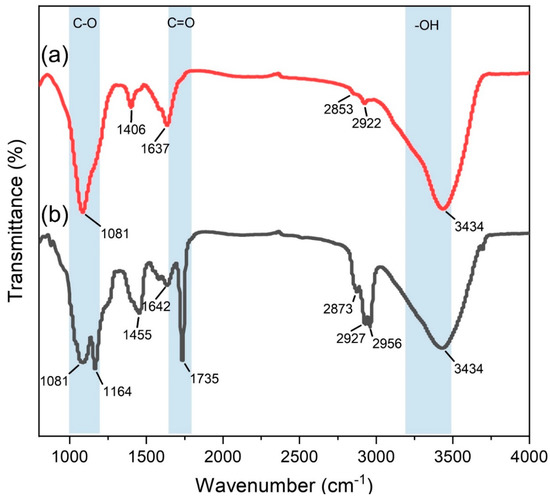 Initially, the performance of CNT and C-CNT was compared and analyzed. The functional group difference between CNT and C-CNT was investigated by FTIR spectroscopy, as shown in Figure 2. There were features at wavenumbers 1000–1200 cm−1, 1600–1680 cm−1, and 2840–3000 cm−1 for CNT and C-CNT, corresponding to C–O, C=C, –CH stretching, respectively. The features at wavenumbers 1406 cm−1 for CNT and 1455 cm−1 for C-CNT were attributed to –CH bend vibration. Compared with CNT, C-CNT showed additional characteristic peaks at 1164 cm−1 and 1735 cm−1, which can be attributed to the C–O (1000–1200 cm−1) and C=O (1650–1800 cm−1) stretching vibrations of the carboxylic group. Moreover, the peak observed for C-CNT at 3434 cm−1 originated from the stretching frequency of –OH (3200–3500 cm−1). The results show that –COOH and more –OH functional groups appeared on the surface of C-CNT compared with CNT.