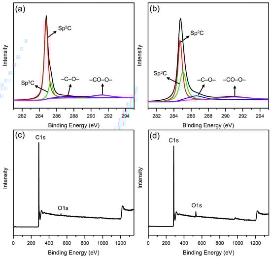 XPS analysis was used to study the differences between elements and functional groups on the surface of CNT and C-CNT. Figure 3 presents C1s XPS spectra and XPS survey scans of CNT and C-CNT. The C1s peak was deconvoluted by XPS-PEAK software and divided according to four binding energy positions in order to analyze the content of different functional groups, as shown below: Sp2 C (284.8 eV), Sp3 C (285.1 eV), –C–O– (286.2 eV) and –CO–O– (290.1 eV). The content of the functional groups and element content of CNT and C-CNT were summarized in Table 1 and Table 2, respectively. More O atom content was observed in C-CNT, with a twofold increase in the O/C ratio compared to CNT, implying that C-CNT had more oxygen-containing functional groups on the surface. Compared with CNT, the content of –C–O– of C-CNT increased from 7.04% to 11.74%, and the content of –CO–O– also increased, which indicated that C-CNT had more –COOH and –OH functional groups, which was also in agreement with the results of FTIR analysis.