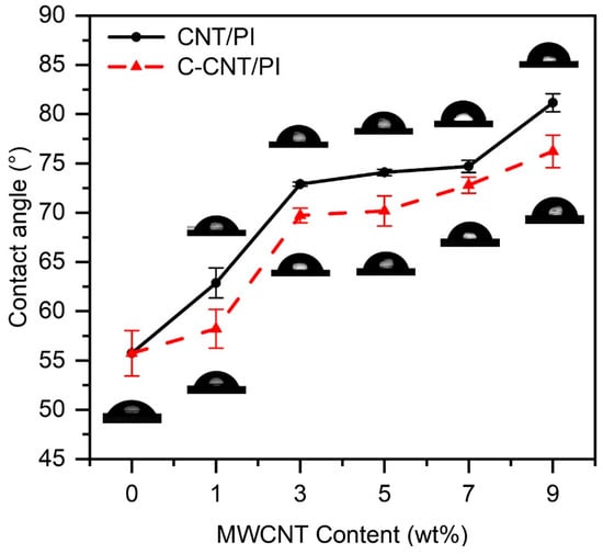 The contact angle can provide information about surface chemistry because it is sensitive to surface chemistry. Therefore, the water contact angle of the films was tested and summarized in Figure 4 and Table 3. The contact angle of CNT/PI and C-CNT/PI films increased with the increase in CNT and C-CNT content, and CNT/PI films exhibited larger contact angles than CNT/PI films. The main chain of polyimide contains carbonyl groups, which can form hydrogen bonds with hydroxyl groups, so the hydrophilicity was good (55.74°). As a super hydrophobic material with a water contact angle of up to 158° [49], CNT can improve the hydrophobicity of PI films. When the CNT content was 9 wt.%, the contact angle of CNT-PI film was increased to 81.17°, which is 45.62% higher than that of pure PI film. However, C-CNT was not so effective in improving the contact angle of PI films because the carboxyl group in C-CNT was hydrophilic, so the hydrophobicity of C-CNT was not as good as that of CNT [50]. As a result, the contact angle of C-CNT/PI films only increased to 76.23 when the content of C-CNT was 9%, which was 36.76% higher than that of pure PI films. In a word, CNT and C-CNT can improve the contact angle and hydrophobicity of PI films, and the effect is best when 9 wt.% CNT is added. As a result, the self-cleaning, antifouling, and anti-corrosion properties of the films have been improved, which has a broader prospect in fields such as aerospace and medical care.