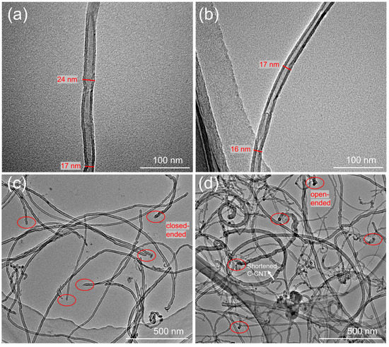 TEM examination of CNT and C-CNT was performed to investigate the morphology and dispersion. For the CNT and C-CNT showed in Figure 5, the average diameter was in the range of 10–20 nm and had similar profiles. However, C-CNT with a shorter length appeared (at the white arrow in Figure 5d). Notably, CNT was usually closed-ended (indicated by the circles in Figure 5c), whereas C-CNT was typically open-ended (indicated by the circles in Figure 5d) [51]. The reason is that the reaction usually starts at the defect sites such as the heptatomic rings, the –CH2 and –CH groups [46], which often exist at both ends and surface of CNT, leading to the cutting and opening of carbon nanotubes after strong acid treatment. The dispersion of CNT and C-CNT in the NMP solution, as seen by TEM, was very different; CNT was clustered into bundles (Figure 5c), while C-CNT was randomly and loosely dispersed in the NMP solution (Figure 5d), neither of them had any particulate impurities. Due to the tiny size of CNT, there is a relatively strong van der Waals force, which makes it easy to become entangled or reunited into bundles. After acid treatment, C-CNT was cut short, reducing the agglomeration and bonding state of long fibers, and the carboxyl group on the surface of C-CNT increases the surface polarity of C-CNT, which makes C-CNT well dispersed in a polar solvent (NMP solution). In addition, C-CNT was observed to be locally agglomerated and present a buckling shape. This phenomenon can be related to them being mostly open-ended anchoring near CNTs because, after acid treatment, C-CNT was grafted with carboxyl groups (both ends and weak points on the surface), and hydrogen bonds were easily formed between carboxyl groups. Moreover, the structure of C-CNT was not damaged because both CNT and C-CNT showed a multiwall structure. In conclusion, C-CNT was grafted with new functional groups to open the fracture, and the tube wall structure was not damaged.