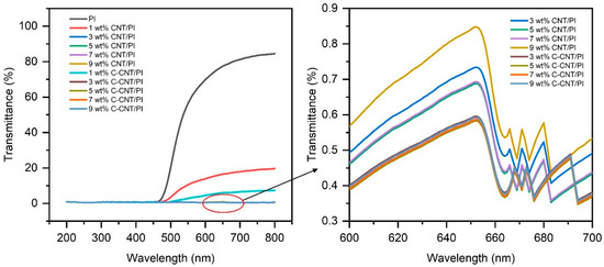 With UV-visible spectroscopy, it is possible to detect an absorption band caused by the electron transfer (Cm1 to Vm1 at 650 nm (1.9 eV)) within the van Hove singularities [52]. Here we looked at the high-energy transition at 650 nm to investigate the dispersion of CNT and C-CNT in PI films. The results are shown in Table 4 and Figure 8. The transmittance of CNT/PI and C-CNT/PI films decreased first and then increased with the increase in CNT and C-CNT content. When the filler content was 1%, CNT or C-CNT was not enough to cover the whole film (Figure 5a,b), so the film still maintained a certain transmittance. With the increase in filler content, the transmittance of the films decreased due to the outstanding light absorption of CNT and C-CNT. However, when the content of CNT and C-CNT reached 7 wt.%, the transmittance of the films increased because the high filler content led to a decrease in dispersion. In addition, it is worth noting that the transmittance of C-CNT/PI films was lower than that of CNT/PI films, especially when the filler content was 1 wt.% because the dispersion of C-CNT in the membrane was higher than that of CNT at the same concentration [53]. When CNT or C-CNT agglomerates, the PI film will have areas with few fillers, increasing the light passing through, thus improving the transmittance of the film [54]. The better dispersion of C-CNT than CNT results in lower transmittance of C-CNT/PI films than CNT/PI films and higher transmittance of the film under high filler concentration.