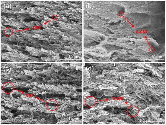 In order to study the dispersion and morphology of CNT and C-CNT in the films, the cross-sections of CNT/PI and C-CNT/PI films with filler contents of 0, 1, 3, 5, 7, and 9 wt.% were observed by SEM (Figure S1). The cross-sections were the fracture surfaces of the broken films after the mechanical properties test. As shown in Figure 9, CNT and C-CNT are marked with red circles. When the film is stretched, the strong adhesive interaction between carbon nanotubes and polymer matrix will produce stress, leading to local plastic deformation and rough fracture surface [47]. The C-CNT was mainly broken near the surface of the PI matrix, and compared with CNT/PI film, C-CNT/PI film had less filler exposed outside the matrix and a shorter filler length. This phenomenon means that the interfacial adhesion between C-CNT and PI matrix was better than CNT, which made C-CNT harder to be pulled out when the film broke [54]. Because of the hydrogen bonds formed by the H atom of the –COOH group on the surface of C-CNT and the C=O bond of the PI molecule, C-CNT was less agglomerated than CNT. As a result, C-CNT can be well wetted by the PI matrix, so the interfacial adhesion between C-CNT and PI matrix was better than CNT. In brief, C-CNT had better dispersion and less aggregation than CNT in the film, so it had better interaction with the PI matrix.
