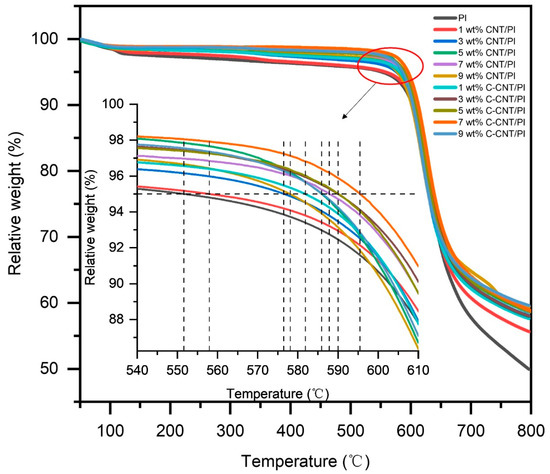 The thermal behaviors of PI films with various CNT and C-CNT contents were examined by TGA to evaluate the thermal stability, and the results are shown in Figure 10. The thermal decomposition of the PI film started at about 500 °C [55]. It can be seen from Table 5 that the 5 wt.% loss temperature of the pure PI film was only 551.63 °C. After mixing with CNT or C-CNT, the 5 wt.% loss temperature of the films was significantly increased and reached the highest value when the content was 7 wt.%. With the further increase in the content of CNT or C-CNT, the 5 wt.% loss temperature of the films decreased. This behavior may be due to the fact that excessive fillers tend to agglomerate and hinder heat transfer, generating high-temperature spots, thus affecting the continued improvement of thermal stability. At the same content, C-CNT showed a better effect of improving the thermal stability of the film than CNT, and the 5 wt.% loss temperature could reach up to 595.49 °C (7 wt.% C-CNT/PI film), which may be related to the high thermal stability of C-CNT and good filler-polymer affinity [56]. Moreover, the improved thermal resistance of PI films after mixing with CNT and C-CNT also led to a higher residual rate at 800 °C, from 49.93% (pure PI film) to 59.61% (9 wt.% C-CNT/PI film).