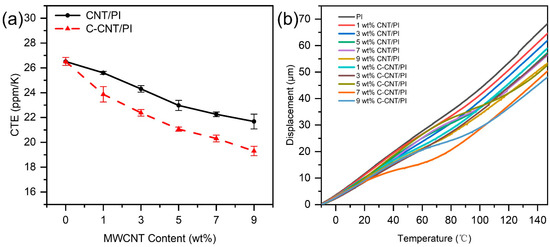Figure 11. (a) Summary of the CTE values of PI films with different contents of CNT and C-CNT and (b) TMA curves of PI, CNT/PI and C-CNT/PI films.