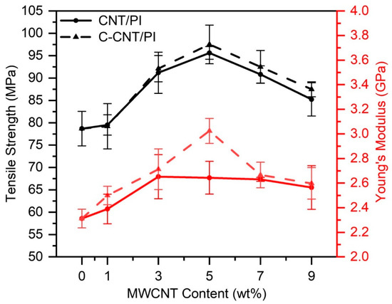 In order to investigate the effect of CNT and C-CNT in PI films, the mechanical properties of the films were further tested, and the experimental results are shown in Figure 12. According to the results in Table 7, both the tensile strength and Young’s modulus of films increased up to a maximum value and then decreased with the content of the filler. The tensile strength and Young’s modulus of CNT/PI and C-CNT/PI films reached the highest value at 5 wt.% filler content, and C-CNT had a better mechanical reinforcement effect on PI films. When the content of fillers reached 5 wt.%, the tensile strength of the CNT/PI and C-CNT/PI films increased to 95.61 and 97.52 MPa, respectively, which increased by about 21.50% and 23.93% compared with pure PI films (78.69 MPa). When the content of C-CNT was 5 wt.%, Young’s modulus of C-CNT/PI film reached the highest value of 3.02 GPa, which was 30.82% higher than that of pure PI films (2.31 GPa). However, the turning point of Young’s modulus of CNT/PI film was earlier (3 wt.%), which was only 14.35% higher than that of pure PI films. In particular, compared with CNT/PI films, the tensile strength and Young’s modulus of C-CNT/PI films were higher when the filler content was the same. In Figure 7e,f, the 9 wt.% CNT/PI film surface had small visible particles formed by CNT agglomeration, while the 9 wt.% C-CNT/PI film did not have these particles. Therefore, the dispersion of C-CNT in the films was more uniform than that of CNT, and due to the existence of –COOH groups, both the interaction between C-CNT and PI matrix and the interface performance was improved. The dispersion of fillers in polymers and the interaction between fillers and polymers play a vital role in enhancing the mechanical properties of polymer composites; as a result, the mechanical properties of C-CNT/PI films are better improved. Similarly, when the filler content is too high, the dispersion of the filler in the film will be reduced, and agglomeration will occur. When CNT or C-CNT aggregates, the matrix is difficult to penetrate into it, and the CNT cluster lacks load transfer capability [63]. Meanwhile, there is a poor binding force between CNT clusters [64]; thus, the mechanical properties are mainly determined by the matrix. Therefore, at higher filler content (>5 wt.%), the mechanical properties of CNT/PI and C-CNT/PI films will decrease.