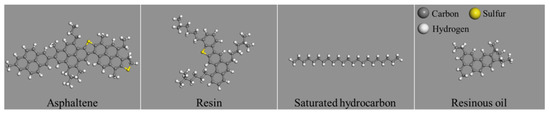 The four components of the model of asphalt used by Hansen [38], based on the results of extensive experiments, were adopted in this study, including asphaltene, resin, saturated hydrocarbon, and resinous oil, as is shown in Figure 1.