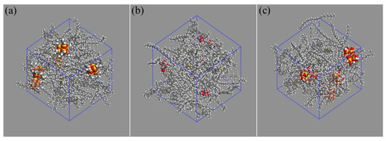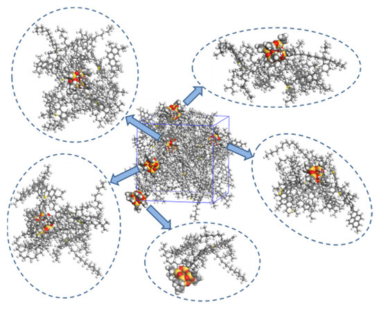 The construction of nanomaterial-modified asphalt models was based on the four-component asphalt model and nanomaterial models. The number of nanoclusters in nano-OvPOSS-modified asphalt models was chosen to be 5, since it was the least amount required in a simulation study to obtain adequately representative data displaying the kinetic and thermodynamic properties, especially the aggregation behavior of nanomaterials. In that case, the content of 5 OvPOSS nanoclusters in modified asphalt was determined to be 11% through simulation. To ensure a distinct simulation comparison between nano-OvPOSS, nano-ZnO, and nano-SiO2, the contents of nano-ZnO and nano-SiO2 were set to be 11%, respectively, the same as that of nano-OvPOSS. In this case, the number of ZnO nanoclusters was found to be 6 and that of SiO2 nanoclusters to be 5 through the corresponding simulation. Therefore, in this molecular simulation study, the content of 11% is appropriate to manifest the difference of the effects of nano-OvPOSS, nano-ZnO, and nano-SiO2 on the properties of asphalt from the microscopic perspective. The molecular formula and total number of molecules contained in the three nanomaterial-modified asphalt systems are shown in Table 1. The initial models are presented in Figure 5.