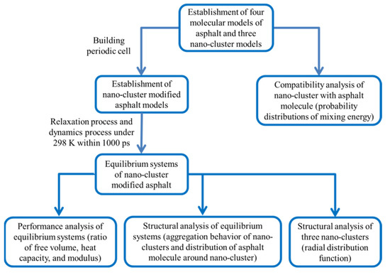The Amorphous Cell tool of Materials Studio (MS) was adopted to construct the modified asphalt models with three-dimensional periodic cell at room temperature. Additionally, then the Forcite tool and Blends tool were employed to perform the dynamics and compatibility simulation. The initial density of model was set as 1.0 g/cm3 and the time step was 1.0 fs. The COMPASS (condensed-phase-optimized molecular potential for atomistic simulation studies) force field [39,40] was used to characterize the atomistic interactions. The temperature and pressure in the molecular dynamics simulation process were controlled by the Nose [41] thermostat and Berendsen [42] barostat, respectively. Additionally, the decay constant of the temperature control method and pressure control method were both 0.1 ps. Van der Waals interactions and electrostatic interactions were calculated by an atom-based method with a cut off distance of 12.5 Å and PPPM (particle–particle–particle mesh) method with a cut off distance of 12 Å, respectively. Firstly, the geometry optimization program was used to optimize the structure of the initial model, and then the dynamic process for 4 ns was employed to ensure a stable asphalt molecular configuration. Secondly, to obtain the true global potential energy minimum configuration, the anneal process was used to overcome the migration energy barrier in the asphalt system. In this process, the prepared asphalt model was initially heated up to 500 degrees Kelvin (K), and then cooled to 298 K. This anneal process was carried out four times for a total of 4 ns. Thirdly, after these relaxation procedures, the geometry optimization program was used for a second time, and then the molecular dynamic process with the NPT ensemble for 1 ns (298 K, 1 atm) was followed. Additionally, the flow chart of simulation study is shown in Figure 6.