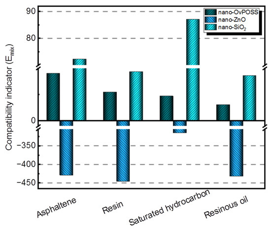 To be more specific, the quantitative analysis is also studied. Figure 11 expresses the compatibility indicator Emix, which is concerned with the quantitative analysis of the compatibility of the three nanomaterials with four asphalt components. If the absolute value of Emix is the smallest, the compatibility of two materials is the best. It can be seen from Figure 11 that the absolute values of Emix of nano-OvPOSS with four asphalt components are the lowest, all of which are below 70. In addition, it becomes apparent that the absolute values of Emix of nano-ZnO with corresponding asphalt components are the highest, which are all above 300; it is further determine that the absolute values of Emix of nano-SiO2 with corresponding asphalt components lie in between. The simulation results present the compatibility order of the three nanomaterials with asphalt components: that is to say, nano-OvPOSS offers the best compatibility with asphalt, followed by nano-SiO2 and nano-ZnO subsequently.