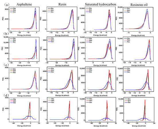 Figure 12a shows the probability distribution of mixing energy of 4.4 Å nano-OvPOSS with asphaltene, resin, saturated hydrocarbon, and resinous oil; Figure 12b–d show the probability distribution of mixing energy of 7 Å, 10 Å, and 20 Å nano-OvPOSS with four asphalt components. It can be seen from Figure 12a that the probability distribution curves of Ebb, Ebs, and Ess in these four pictures are very similar to each other. However, it can be seen from Figure 12b–d that, with the increase in nano-OvPOSS particle size, the probability distribution of Ebb, Ebs, and Ess of nano-OvPOSS with four asphalt components gradually changed from similar to different. Conclusions can be drawn, namely that the size of nano-OvPOSS plays a decisive role in its compatibility with asphalt components. Generally, the smaller the particle size of nano-OvPOSS, the better its compatibility with asphalt components. Of note is that nano-OvPOSS with a particle size of 4.4 Å has the best compatibility with asphalt components.