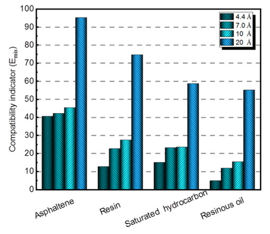 Figure 13 is about the quantitative analysis of the compatibility of nano-OvPOSS in different sizes with four asphalt components, which expresses the compatibility indicator Emix of asphalt blends. As can be seen, the absolute value of Emix of 4.4 Å nano-OvPOSS with each asphalt component is the smallest compared with that of 7 Å, 10 Å, and 20 Å nano-OvPOSS. With the increase in the particle size of nano-OvPOSS, the absolute value of Emix of nano-OvPOSS with four asphalt components also increases. Simultaneously, compared with the other three asphalt components, the resinous oil expresses the smallest absolute value of Emix of each size of nano-OvPOSS. Conclusions can be drawn that the four sizes of nano-OvPOSS all have the best compatibility with resinous oil, and that the smaller the particle size of nano-OvPOSS is, the better its compatibility with asphalt components will be.