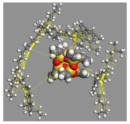 In this section, the distribution of asphalt molecules around nano-OvPOSS, nano-ZnO, and nano-SiO2 was analyzed to clarify the superiority of nano-OvPOSS as asphalt nano-modifier. The distance between the centroid of nanocluster and the centroid of asphalt molecule was taken as the distance between nanocluster and asphalt molecule. The cut off distance in the molecular dynamics process was set as 12.5 Å. With the inclusion of the distance between the centroid of nanocluster and its surface atoms which was about 2.5 Å, the cut off distance was therefore chosen to be 15 Å for data counting. Figure 14 shows the distribution explanatory drawing of asphaltene, resin, saturated hydrocarbon, and resinous oil around OvPOSS nanocluster. As is shown in the figure, the number of the asphaltene molecules around the OvPOSS nanocluster is 1, and the distance between the centroid of asphaltene molecule and the centroid of OvPOSS nanocluster is 10.4 Å; as for the resin molecule, the number is 1 and the distance is 9.5 Å; as for the saturated hydrocarbon molecule, the number is 1 and the distance is 10.3 Å; as for the resinous oil molecule, the number is 1 and the distance is 13.2 Å. In conclusion, the average distance between OvPOSS nanoclusters and asphalt molecules is 10.9 Å and the average number of asphalt molecules around the OvPOSS nanocluster is 1.