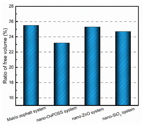 As is shown in Figure 17, without the nanomaterials, the value of RFV is 25.5%. With the separate addition of nano-OvPOSS, nano-ZnO, and nano-SiO2, the value of RFV reduces to 23.1%, 25.3%, and 24.4%. It can be seen that the RFVs of matrix asphalt and the three nanomaterials-modified asphalt are all between 20–30%, and that the separate addition of nano-OvPOSS, nano-ZnO, and nano-SiO2 all leads to the shrinking of the free movement space of molecules in the asphalt system. Compared with nano-ZnO and nano-SiO2, nano-OvPOSS reduces the largest amount of RFV of matrix asphalt, which can be reduced by 9.4%. This is because its unique structure of eight vinyl groups allows nano-OvPOSS to reinforce its combination with asphalt molecules and promote a non-bonding interaction.