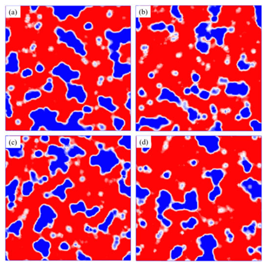The free volume and occupied volume of asphalt systems: (a) matrix asphalt; (b) nano-OvPOSS-modified asphalt; (c) nano-ZnO-modified asphalt; (d) nano-SiO2-modified asphalt (Free volume is blue and occupied volume is red).