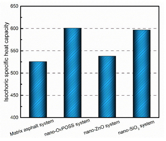Heat capacity is used to describe the amount of heat required to raise the temperature of a given amount of substance by 1 K. The larger the heat capacity, the more heat it absorbs when it raises 1 K. In this study, the isochoric specific heat capacity (Cv) of the matrix asphalt system and the nanomaterial-modified asphalt systems was simulated. The simulation results of Cv are shown in Figure 19. It can be seen that the order of Cv is nano-OvPOSS-modified asphalt system > nano-SiO2-modified asphalt system > nano-ZnO-modified asphalt system > matrix asphalt system. Obviously, nano-OvPOSS increases the largest amount of Cv of matrix asphalt, which can be increased by 14.3%. Meanwhile, it is notable that the Cv of nano-OvPOSS-modified asphalt system is slightly higher than that of nano-SiO2-modified asphalt system. This is because nano-OvPOSS and nano-SiO2 have similar skeleton structure composed of silicon, and the silicon content of OvPOSS nanocluster is almost the same as that of SiO2 nanocluster. It can be seen that all of the three nanomaterials can improve the Cv of matrix asphalt, which suggests the addition of the nanomaterial is able to alleviate the thermodynamic instability of matrix asphalt. Significantly, nano-OvPOSS and nano-SiO2 perform better in improving the Cv of matrix asphalt than nano-ZnO.