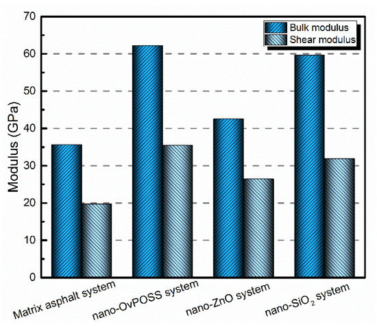 To investigate the effect of the nanomaterials on the deformation resistance of matrix asphalt, the physical moduli of the matrix asphalt system and the nanomaterials-modified asphalt systems were calculated, including bulk modulus and shear modulus. The simulation results are summarized in Figure 20. As is shown in Figure 20, compared with matrix asphalt, the bulk modulus of the nano-OvPOSS-modified asphalt, nano-ZnO-modified asphalt, and nano-SiO2-modified asphalt increases by 74.7%, 19.4%, and 67.4%. Additionally, the shear modulus of these three nanomaterials-modified asphalts increases by 80.2%, 34.5%, and 61.9%. The increase in the modulus of each modified asphalt system shows that the three nanomaterials all have a positive effect on the mechanical properties of matrix asphalt. It is notable that the increase in the modulus of nano-OvPOSS-modified asphalt is the largest, which means nano-OvPOSS does best in improving the mechanical properties of matrix asphalt.
