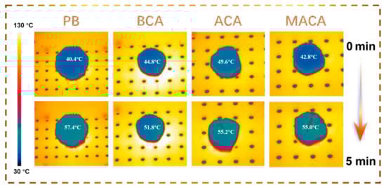 Infrared images of PB, BCA, ACA, and MACA to detect the temperature of the top surfaces of materials. The samples were put on a 130 °C hot disk for 5 min.