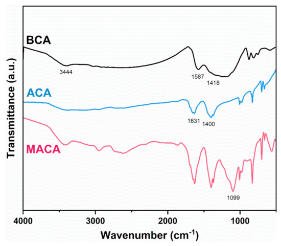 Figure 4 shows the FT−IR spectra of BCA, ACA, and MACA. The bagasse skeleton contains an amount of cellulose and hemicellulose, which are rich in oxygen-functional groups such as O−H at 3444 cm−1 [31]. The peak related to the stretching vibration of O−H is barely observed in the spectrum of BCA, indicating the occurrence of dehydration and carbonization reactions [31,32,33,34,35,36,37,38]. The absorption bands at 1587 cm−1 and 1418 cm−1 correspond to the C=C vibrations of the aromatic ring, resulting from the dehydrogenation and aromatization of saccharide molecules [31,39]. The oxygenated functional groups on ACA are produced in the KOH activation process [40] Thus, the adsorption peak at 1631 cm−1 in the spectrum of ACA is assigned to the water adhered to the material’s surface, attributing to an increase in hydrophilicity of the activated porous material [41]. Additionally, the band at 1400 cm−1 corresponds to the vibrations of the aromatic ring [13]. In the spectrum of MACA, a new absorption peak at 1099 cm−1 is attributed to the stretching vibration of Si−O−Si, which is direct evidence of the coating of PDMS [42].