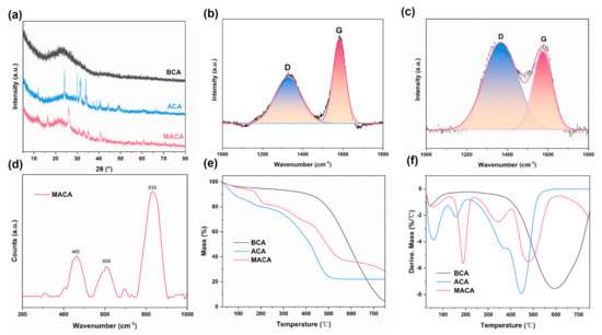 (a) XRD patterns of BCA, ACA, and MACA; Raman spectra of (b) BCA, (c) ACA, and (d) MACA; (e) TGA and (f) DTG curves of BCA, ACA, and MACA.