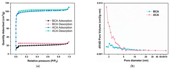 (a) N2 adsorption−desorption isotherms of BCA and ACA; (b) Pore size distributions (0–70 nm) of samples by using BJH model.