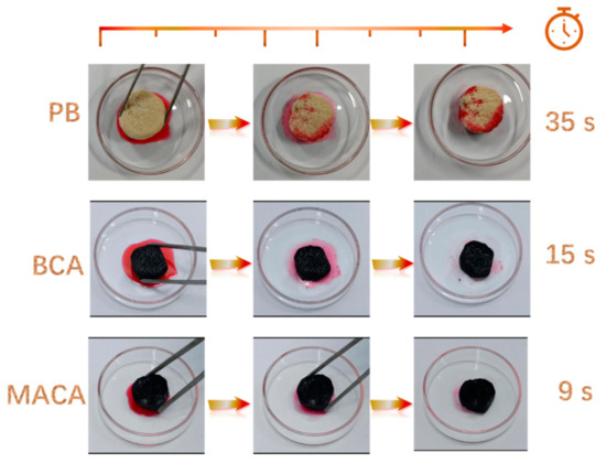 Owing to its apparently low density, high surface hydrophobicity, high porosity, and lipophilicity, the MACA could be an ideal candidate for the absorption of oil/organic solvents. Based on this idea, absorption experiments of gasoline (dyed with Sudan IV) were conducted for demonstration purposes (Figure 10), and further detailed absorption processes are shown in Movies S1, S4 and S5. A moderate amount (approximately 2 mL) of red gasoline to each petri dish. PB, BCA, and MACA can absorb the liquid on the petri dishes, individually. Digital pictures were taken to keep track of absorption performances at different time nodes. By comparison, it was clearly noticeable that the absorption velocities of porous aerogels after hydrophobic modification were enhanced, and the entire oil could be absorbed completely by MACA within 9 s. In addition, the surface of porous MACA is similar to that of natural lotus leaves with abundant randomly distributed papillary protuberance, which improves the hydrophobicity and enhance the oil-water separation ability of porous material [32]. The adsorption capacity of polymer/DE-modified porous material greatly increased and MACA had the highest adsorption capacity of 8.38 ± 0.38 g/g, because MACA has a special bionic-like surface structure, high total pore volume, and the highest WCA (137.6° ± 0.9°). In contrast, the oil adsorption capacities of PB, BCA, and ACA are 3.19 ± 0.19, 5.14 ± 0.40, and 7.29 ± 0.30 g/g, respectively. Additionally, the coating content plays an important role in determining the absorption capacity of coated porous material. The oil absorption capacity of MACA-2 and MACA-3 decreased to 5.72 ± 0.62 and 3.26 ± 0.35 g/g, respectively (Figure 11a). The reductions can be attributed to the excess amount of polymer/DE filling the 3D-structure and pores within the material, leading to the reduced porosity of the samples (Figure S2) [21]. As the absorption process shows in Figure 12, gasoline floating on the water surface and tetrachloromethane sinking under the water were absorbed to further identify the oil-water separation capability of MACA (Movie S6–S7). This experiment indicates that MACA can be used to separate oil and water effectively without complicated operations. Furthermore, another three organic solvents were selected to test the universality of absorption. MACA exhibits high adsorption capacities (Table S1), and the absorptive amounts are 7.05 ± 0.52, 12.31 ± 0.30, 9.28 ± 0.28, 7.05 ± 0.52, 4.06 ± 0.15, 6.81 ± 0.60, 7.72 ± 0.38, and 5.52 ± 0.24 g/g for xylene, carbon tetrachloride, dichloromethane, ethanol, petroleum ether, isopropyl alcohol, methanol, and hexane, respectively (Figure 11b).