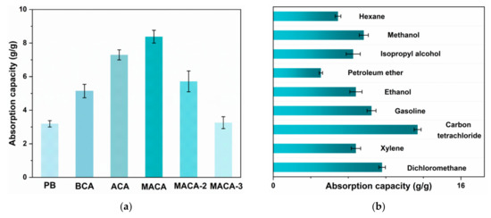 (a) Gasoline absorption capacities of different samples; (b) absorption capacities of MACA to different organic solvents and oil.