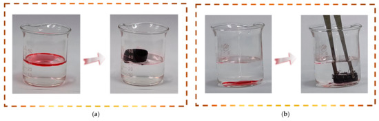(a) Snapshots of the removal processes of (a) gasoline (dyed with Sudan IV) floating on water and (b) carbon tetrachloride (dyed with Sudan IV) sinking below the water by using MACA as the adsorbent.