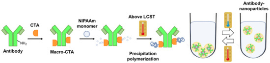 Design concept of the temperature-responsive antibody–nanoparticles prepared using the “grafting from” and “thermal precipitation” methods.