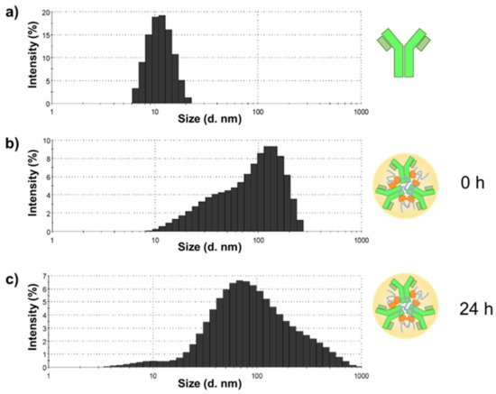 As the particle size of IgG–PNIPAAm was confirmed by FFF, the morphology of IgG–PNIPAAm in water solution was measured by DLS. Figure 4 shows the DLS results of IgG, IgG–PNIPAAm, and IgG–PNIPAAm after standing for 24 h. The particle sizes of IgG and IgG–PNIPAAm were approximately 10 ± 2.3 and 100 ± 53.3 nm, respectively. These results indicate that the conjugation of PNIPAAm to IgG using the GF method resulted in the formation of IgG–PNIPAAm nanoparticles. Moreover, the IgG–PNIPAAm retained its particle form after 24 h of standing, suggesting its high stability (Figure 4b,c). This could be attributed to the hydrophobic interactions of CTA (Figure S3 in the Supporting Information), as well as the entanglement of the grafted polymers. However, several reports have revealed that PNIPAAm chains can undergo “self-crosslinking” by chain-transfer reactions and that microgels can be prepared without the use of a crosslinking agent [35]. The FFF and DLS measurement results indicated the formation and stability of antibody nanoparticles with a size of approximately 100–200 nm. The zeta potential of the antibody was also measured to observe if there was any change in the surface potential of the antibody due to the polymer modification, and no apparent difference was observed (Table S3 in the Supporting Information).