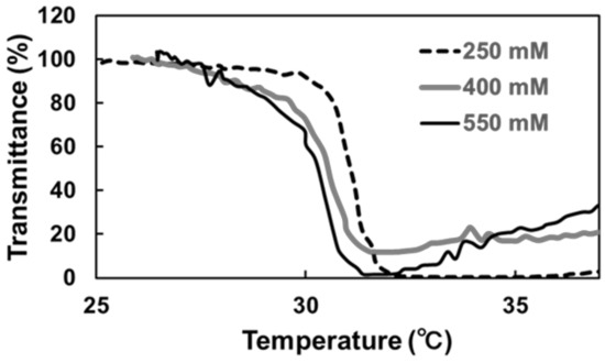 Next, a NIPAAm monomer and an initiator were added to the synthesized macro-CTA (IgG-CTA), and IgG–PNIPAAm conjugates were prepared via RAFT polymerization in PBS. The effects of the monomer concentration (250, 400, and 550 mM) on the physical properties, such as polymerization behavior and thermal precipitation, of the conjugates were investigated. Because the reaction occurred above (or near) the LCST, the precipitates were observed 24 h after the reaction under all conditions. The amount of precipitate formed increased as the monomer concentration increased. To confirm the successful polymerization, SDS-PAGE was performed (Figure 2). The sample containing 250 mM of the monomer exhibited a significant shift of the band to a higher molecular weight than the 50 kDa band of the original IgG fragment. In addition, although the band broadened after the polymerization (100–250 kDa), the band shift was clearly observed, indicating the successful conjugation of PNIPAAm to IgG [29,30]. In contrast, no bands were observed for the samples containing 400 and 550 mM of the monomer because the viscosity of these samples was too high for the electrophoresis. Based on the amino residues, it is estimated that approximately 2–3 mol of CTA is introduced per 1 mol of antibody. Therefore, it was considered that about 2–3 PNIPAAm were introduced into the antibody. Additionally, the reaction of NHS with the amino group of IgG results in Fc-dependent binding has been reported [24] and the SDS-PAGE results confirmed an increase in the molecular weight of only the 5 kDa band which corresponds to the Fc fragment. Hence, the conjugating of polymers to the Fc fragment was expected.