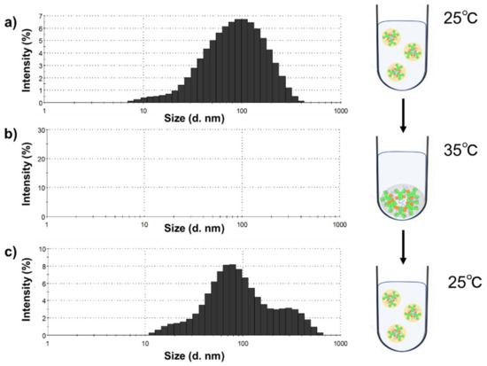 Confirmation of the particle size of IgG–PNIPAAm conjugates in response to temperature using DLS. (a) 25 °C, (b) 35 °C, (c) 25 °C.