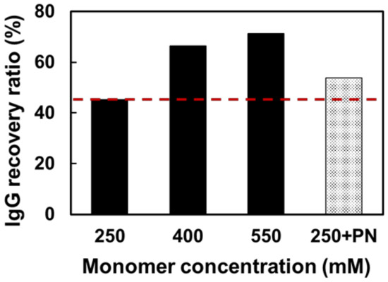 To evaluate whether the monomer concentration of IgG–PNIPAAm affects the thermal precipitation efficiency, the recovery ratio of IgG was measured. Figure S4 shows the thermal precipitation protocol of IgG–PNIPAAm. The recovery ratio was calculated from the balance between the original solution and the supernatant solution. The IgG recovery at monomer concentrations of 250, 400, and 550 mM were 45, 67, and 71%, respectively (Figure 7). The results suggested that the thermal precipitation efficiency increased with increasing monomer concentration. However, under high monomer concentrations, the time taken to re-dissolve after precipitation increased. Therefore, we also examined another approach using free-PNIPAAm to achieve highly efficient thermal precipitation at a low monomer concentration. PNIPAAm homopolymer was added to the solution to enhance the co-sedimentation effect. When PNIPAAm was added to a sample containing 250 mM of the monomer, IgG recovery was improved by approximately 10%. These data suggest that the net amount of free PNIPAAm in solution affects the thermal precipitation efficiency. The obtained recovery ratio was higher than those in previously reported systems that utilized the GT method [29,30]. This could be attributed to the high efficiency of the introduction of macromolecules into the antibody via the GF method compared to the GT method, resulting in higher thermal precipitation efficiency.