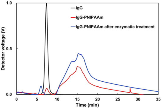One of the advantages of particle formation is that it can protect antibodies from enzymatic degradation. Here, to evaluate the degradation stability of the nanoparticles against enzymes in the body, the enzymatic degradation of the prepared IgG–PNIPAAm conjugates in the presence of trypsin was confirmed under limited acceleration test conditions. The IgG–PNIPAAm conjugates before and after treatment with the enzyme were measured using FFF (Figure 8). A small peak, which overlaps with a peak of native IgG, was observed in the IgG–PNIPAAm chromatogram at approximately 7–8 min, indicating that the IgG–PNIPAAm contains some unreacted IgG molecules. The spectrum of IgG–PNIPAAm after enzymatic treatment revealed that the elution time of the unreacted IgG’s peak (elution time; 6 min) decreased, indicating the degradation of the unmodified IgG by trypsin under this experiment conditions. However, there was no shift in the peak of the IgG–PNIPAAm conjugate (elution time; 10–20 min) before and after the enzyme treatment, suggesting that the particle form can protect antibodies from enzymatic degradation. These data indicated that this antibody–nanoparticle inhibits the action of trypsin.