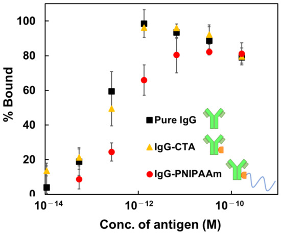 Lastly, the bioavailability of the conjugated antibody was evaluated because one of the concerns of the APC technique is that introduction of polymers into antibody may decrease the binding constant. The apparent binding affinities of IgG–CTA and IgG–polymer conjugates were assessed using a sandwich ELISA (developed in-house). The ELISA result of the free antigen is summarized in Figure 9. The binding constants were estimated using the Scatchard Plot, as described in the Section 2. Generally, the binding constant, KB, of an antibody is known to be 1012 L mol−1. In this study, the estimated binding constants of IgG–CTA and IgG–polymer conjugates were KB = 4.19 × 1012 L mol−1 and KB= 2.00 × 1012 L mol−1, respectively. Although the maximum binding ratio of IgG–PNIPAAm was slightly reduced to approximately 80%, it is presumed that the activity of the antigen–antibody reaction was sufficiently retained. These results indicate that the introduction of polymers using the GF method exerts a slight effect on the activity of antibodies. This investigation suggests the superiority of the GF method, as the introduction of polymers using the GT method in the previous study significantly reduced the binding ratio (KB = 1.40 ± 0.17 × 107 L mol−1) [29]. This explains the formation of nanoparticles by the IgG–PNIPAAm conjugates. It was reported that immobilizing antibodies on the surface of nanoparticles can enhance the signal of ELISA [36]. This suggests that the sensitivity of the ELISA was improved in this study compared to the previous study. To increase the sensitivity of ELISA, protocols generally require several steps to immobilize antibodies on the surface of gold or silica nanoparticles [36,37]. However, in this research, antibody particles can be produced in a single step, making this system highly versatile.
