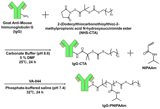 Briefly, the synthesized IgG-CTA (400 μg, 0.0026 μmol) and 200 μL of PBS (pH 7.5) were added to a 1.5-mL microtube. Subsequently, NIPAAm (18 mg, 160 μmol) and 200 μL of PBS containing (3.6 μmol, 1.2 mg) initiator VA-044 were added and dissolved in the previous solution. Thereafter, the reaction was performed in a water bath shaker at 32 °C for 24 h.