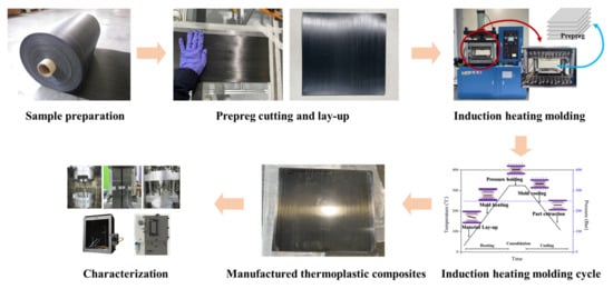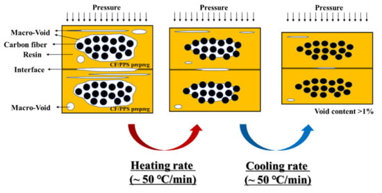 Hot presses are commonly used in the manufacturing of CFRP composites, and can efficiently attain the high temperatures and pressures required to ensure the complete impregnation of thermoplastic composites []. However, their impregnation capabilities deteriorate because of the difficulty in achieving complete resin impregnation during molding. This leads to fiber dislocation and the generation of internal voids, causing the physical and mechanical properties to deteriorate []. In addition, press heaters exhibit limited heating rates, usually below 5 °C/min, and have a high processing time []. Chen et al. [] studied the effect of automated fiber placement (AFP) processing parameters on the mechanical properties of CF/PPS composites from the perspective of void content and crystallinity. They found that the interlaminar void content, rather than the crystallinity, dominated the mechanical properties of the composites. Until recently, the use of thermoplastic composites has been limited owing to impregnation difficulties (pore and void control) and high processing temperature requirements. To overcome these issues, various processes have been developed to improve the impregnation capability of reinforcing fibers using high-performance thermoplastic resins. Ramakrishnan et al. [] manufactured lightweight commingled flax/PP thermoplastic biocomposites using fast induction-heating compression molding. They also investigated the effects of different pressure and temperature cycles on the consolidation quality of the flax/PP biocomposites, and proposed an optimum processing cycle to reduce the manufacturing time without significantly affecting the mechanical properties of the biocomposites.