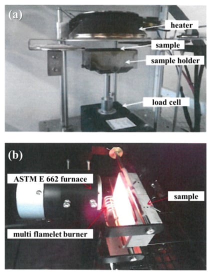where Ds(1), Ds(2), Ds(3), and Ds(4) are the specific optical densities recorded at 1, 2, 3, and 4 min, respectively. Photographs of the cone calorimeter and the smoke density tester are shown in Figure 4.