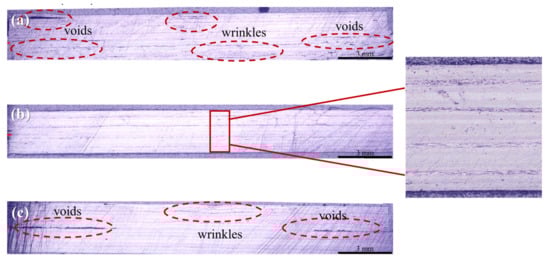 Cross-sectional optical micrographs of the CF/PPS composites; samples obtained at processing temperatures of (a) 250 °C, (b) 280 °C, and (c) 310 °C via induction technology.
