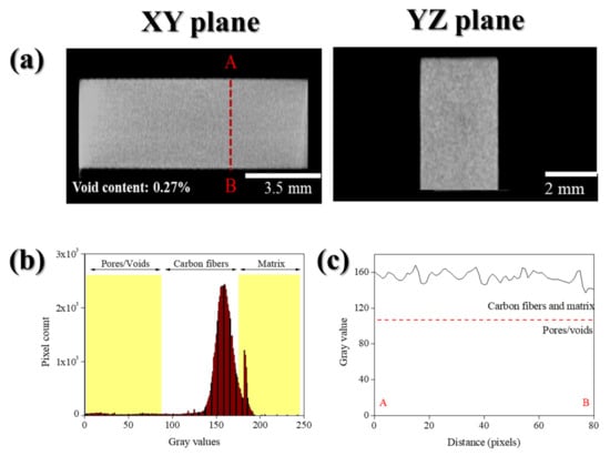 Figure 7a shows the cross-sectional CT images of the CF/PPS composites. While pores or voids were rarely observed, X-ray tomography analysis identified the types of pores. The observed pore were cracks in the plies and transverse cracks in the composite samples, which exhibited a high void rate. Three levels were identified in the histograms of the X-ray CT images (Figure 7b): the left peak was the pore and void area; the middle peak was the CF region, and the right peak was the matrix area. The phase separation between the voids (the pores inside the composite and the background) and the carbon fiber-reinforced polymeric matrix were well defined. A line profile evaluated the line-to-line variation in the XY plane for the grayscale values in the analyzed sample (Figure 7c). The line probe determined the correlation between the grayscale intensity and the material composition, and between the cursor point position on the sample slice and the grayscale associated with the threshold values for each of the sample components. The voxels with a grayscale value less than 100 were classified as the pores, and those with a value higher than 100 were classified as the fibers and matrix [,].