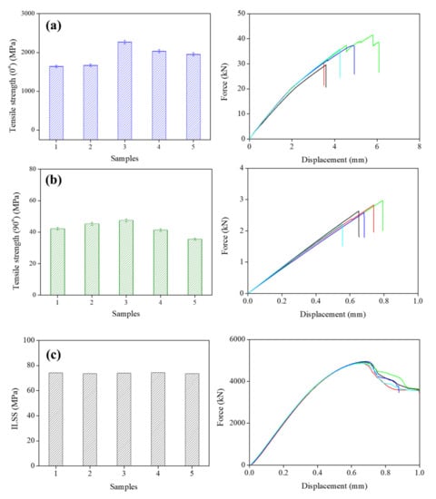 (a) Tensile strength (0°), (b) tensile strength (90°), and (c) ILSS of the CF/PPS composites (processing temperatures of 280 °C).