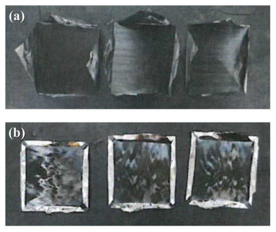 The density of smoke at 10 min (Ds(10)), maximum specific optical density (Dm), and cumulative value of the specific optical density of smoke in the first 4 min (VOF4) are presented in Table 5. The Ds of the CF/PPS composites shows an almost linear increase after approximately 60 s. The CF/PPS composites emit a small amount of smoke with a lower Ds(10) than CFRP and PA610 at 600 s. Additionally, the CF/PPS composites exhibit a lower Dm value than CFRP and PA610. Figure 10 shows images of the CF/PPS composite samples before and after the smoke density tests, demonstrating that no delamination, expansion, shrinkage, or melting occurs.